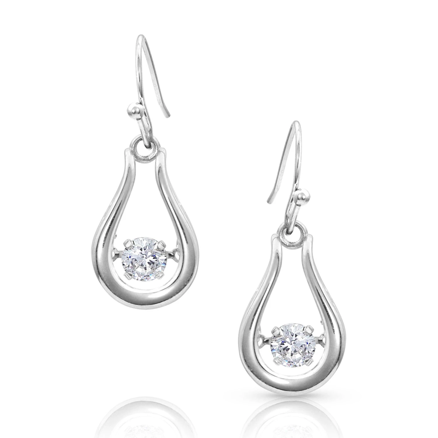 These earrings from Montana Silversmiths are silver toned and have a smooth cupped shape. There is a large clear stone that sits right in the middle held together by two slender arms. These earrings dangle from hypoallergenic French wires.Â