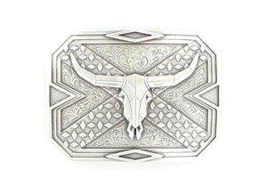 This Rectangular Nocona buckle features a floral background etched into the silver with longhorn skull in center. Boxed for easy gift giving for that special cowboy. Â Rectangle buckle measures approx 3″ x 4″. Â